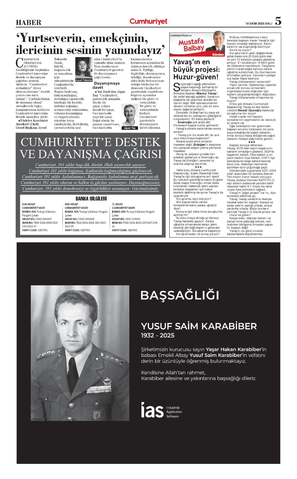 Cumhuriyet Bugünkü Vefat (Ölüm) – Başsağlığı – Anma – Teşekkür – Mevlit İlanları-14.10.2025